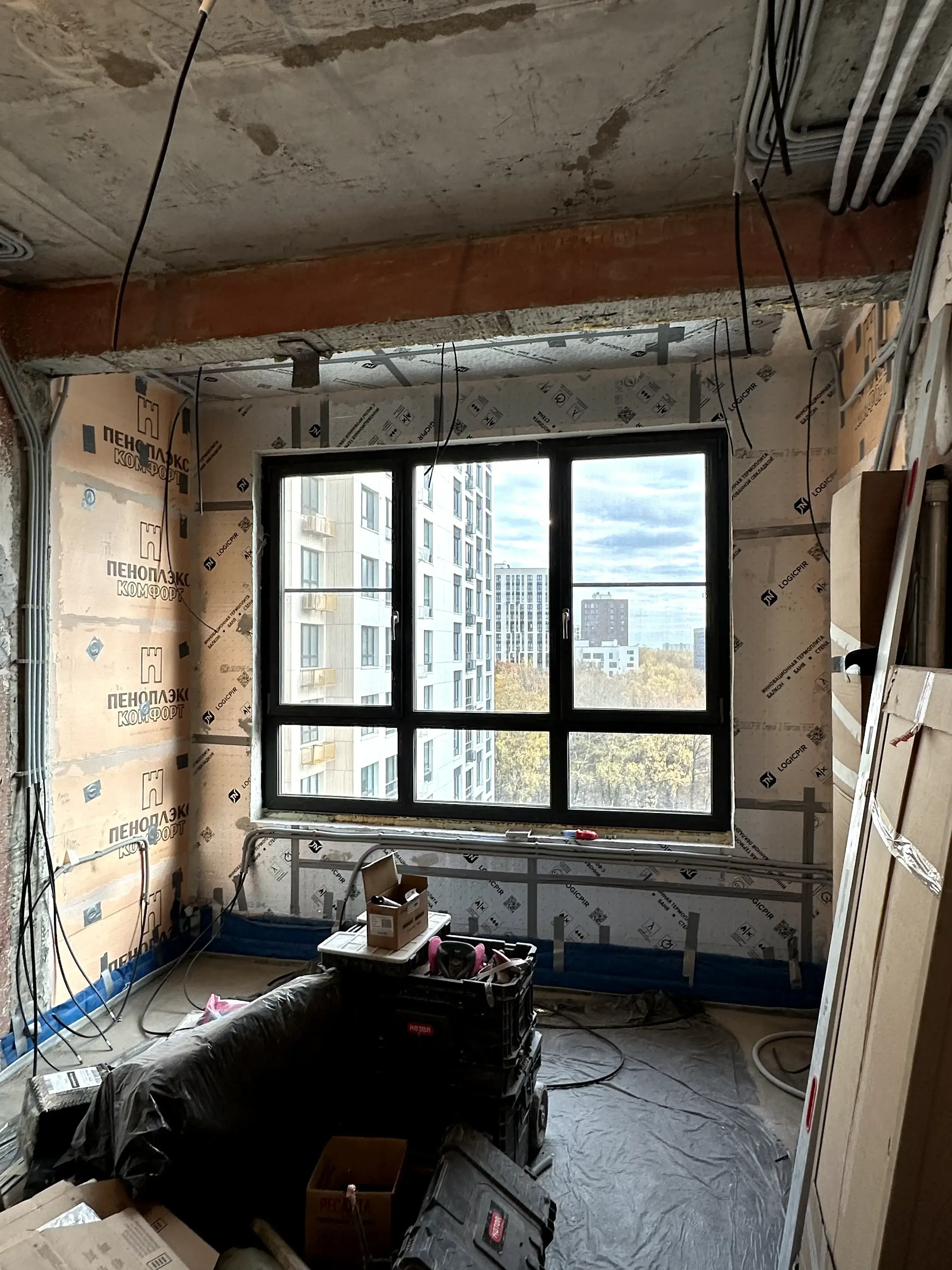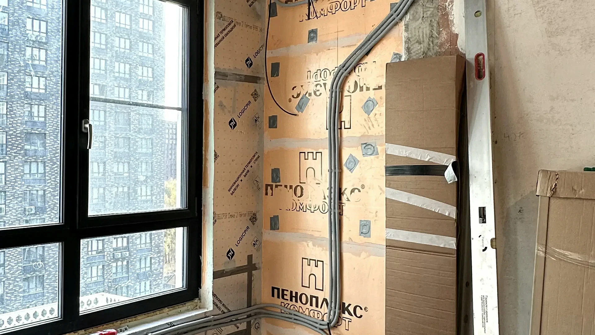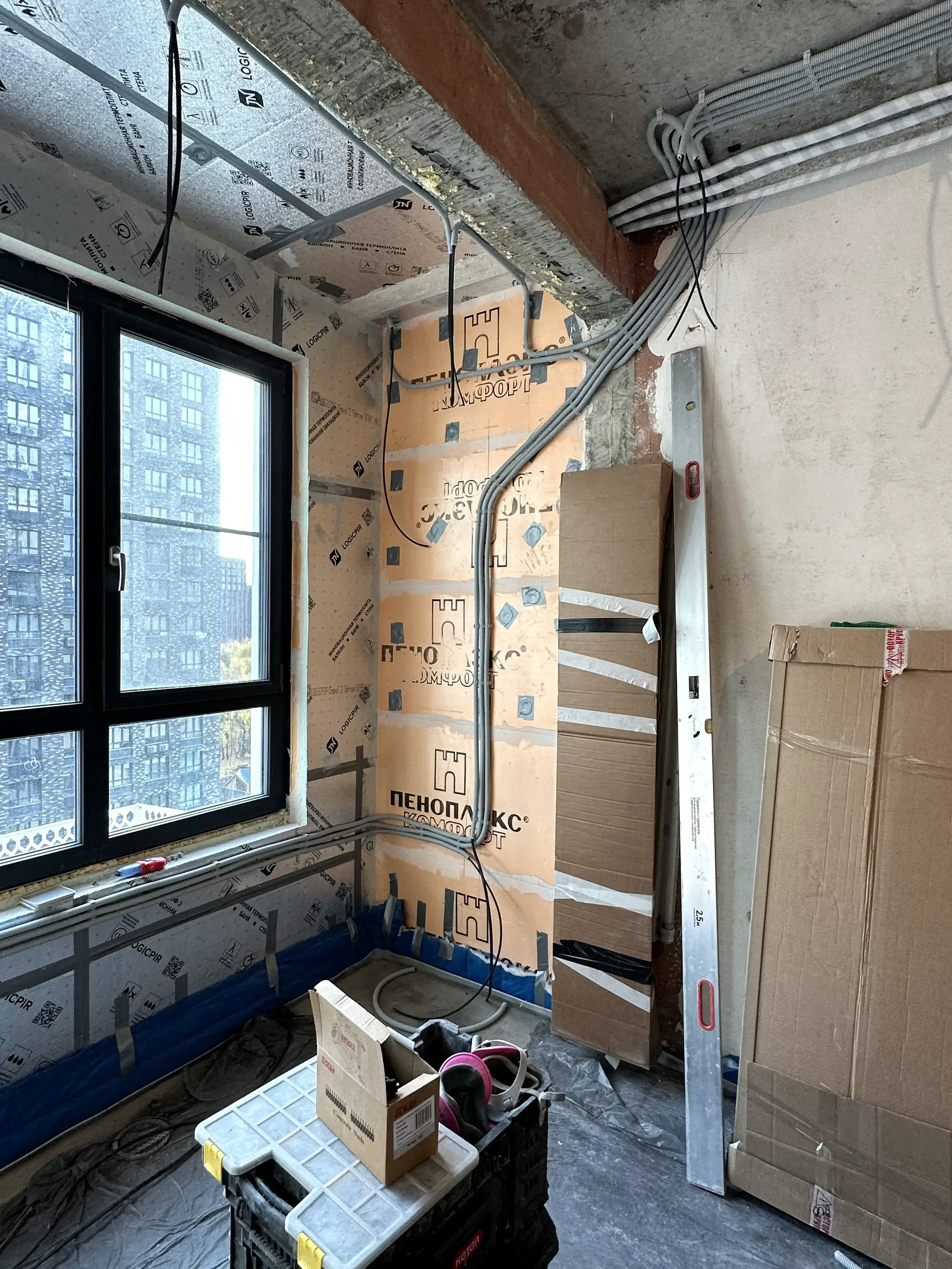 Основной задачей стало создание тёплого пространства, присоединённого к комнате, с надёжной защитой от сильного продувания вентилируемого фасада. Стена со стороны фасада была утеплена в два слоя: использованы пеноплекс и PIR-панели, что позволило исключить мостики холода и обеспечить необходимую теплоизоляцию. Потолок также утеплён PIR-панелями, а все стыки и примыкания тщательно герметизированы.